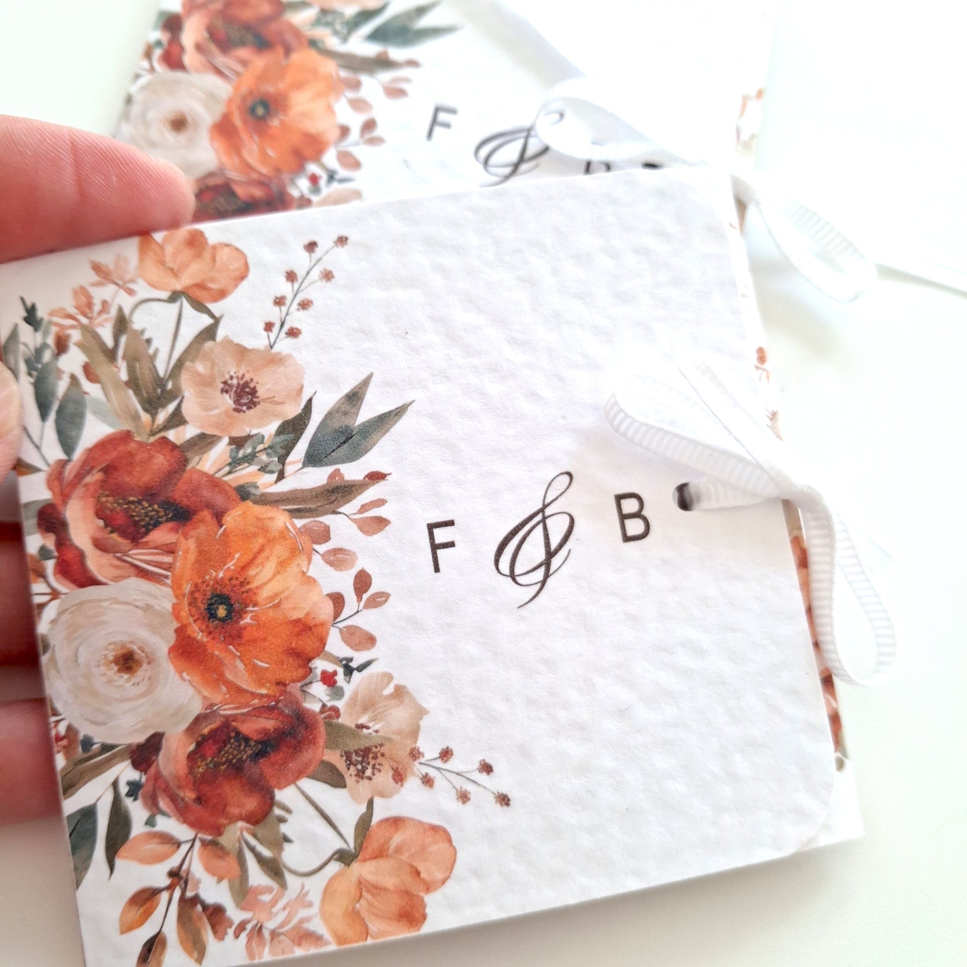 Add a touch of seasonal charm to your celebration with these personalised autumn flower favours. Handmade in the UK from premium textured card and finished with a white ribbon, each favour features a rustic floral design in warm autumn tones.