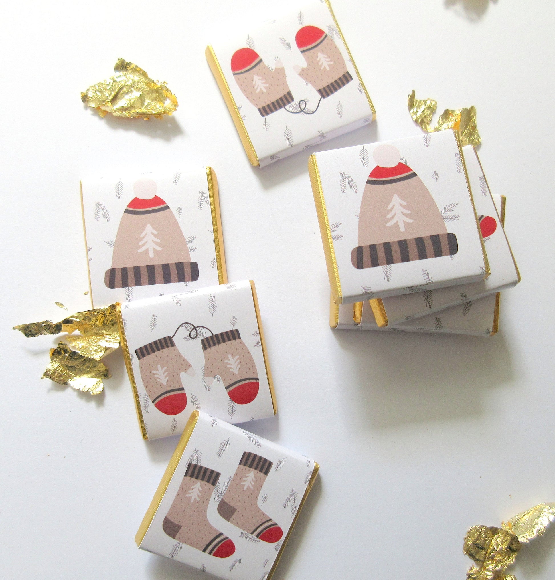 Share warm wishes with these Cosy Christmas Chocolate Favours. Each mini square is wrapped in white paper with gold-foil edges and decorated with winter motifs such as mittens, socks, hats and pine sprigs. Add a short message on the back to make them a thoughtful festive treat for stockings, advent calendars, place settings or party bags.