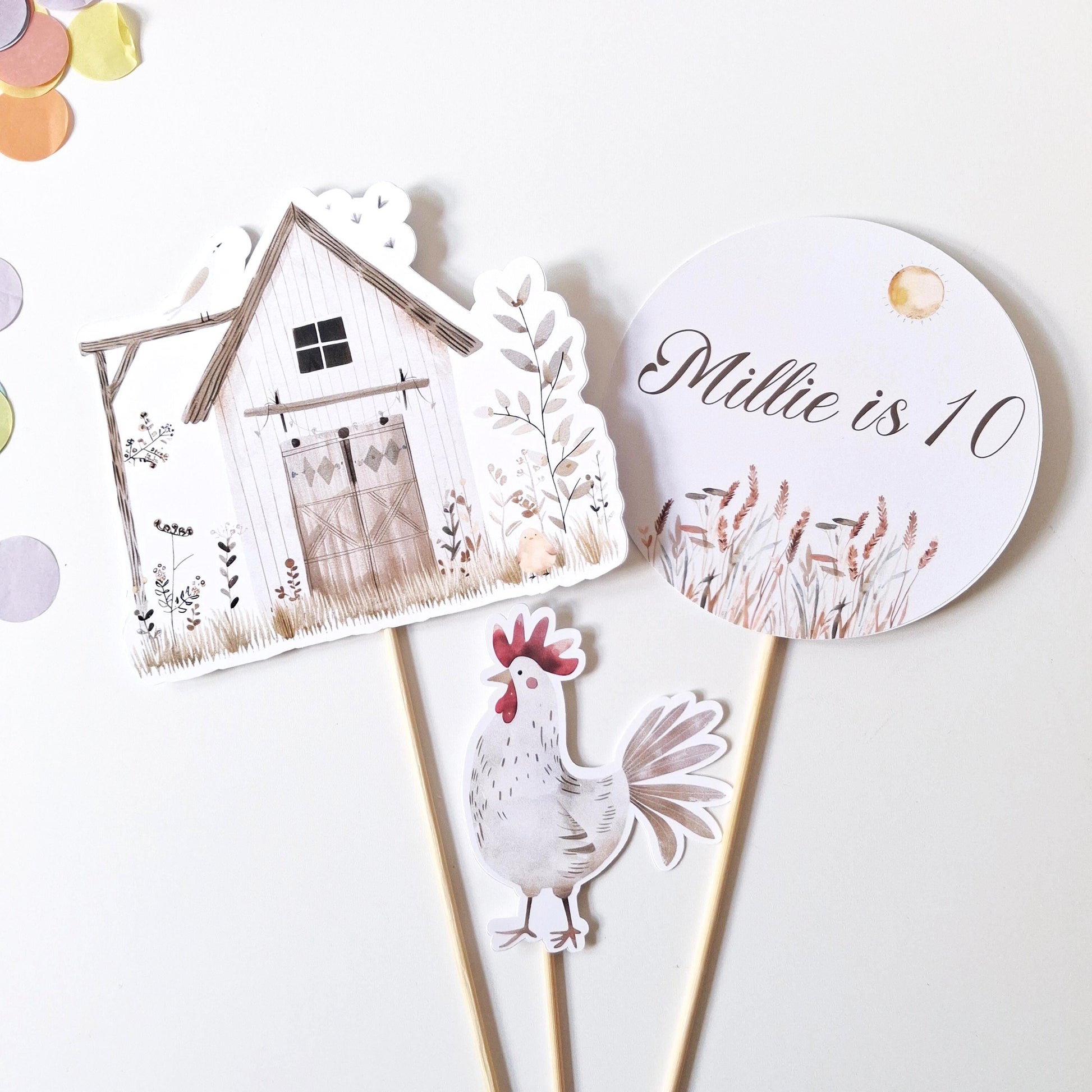 Bring rustic charm to your celebration with this Personalised Farm Cake Topper Set. The set creates a sweet barnyard scene on your cake with five toppers featuring a classic barn, a rooster and friendly chickens, plus a personalised name-and-age topper to make the display uniquely yours. A coordinating self-standing barn figure completes the look on your party table.