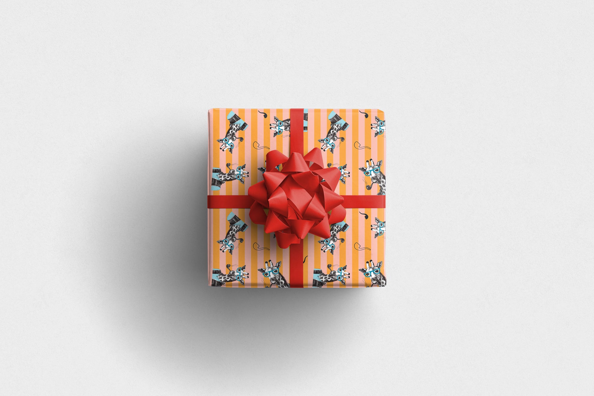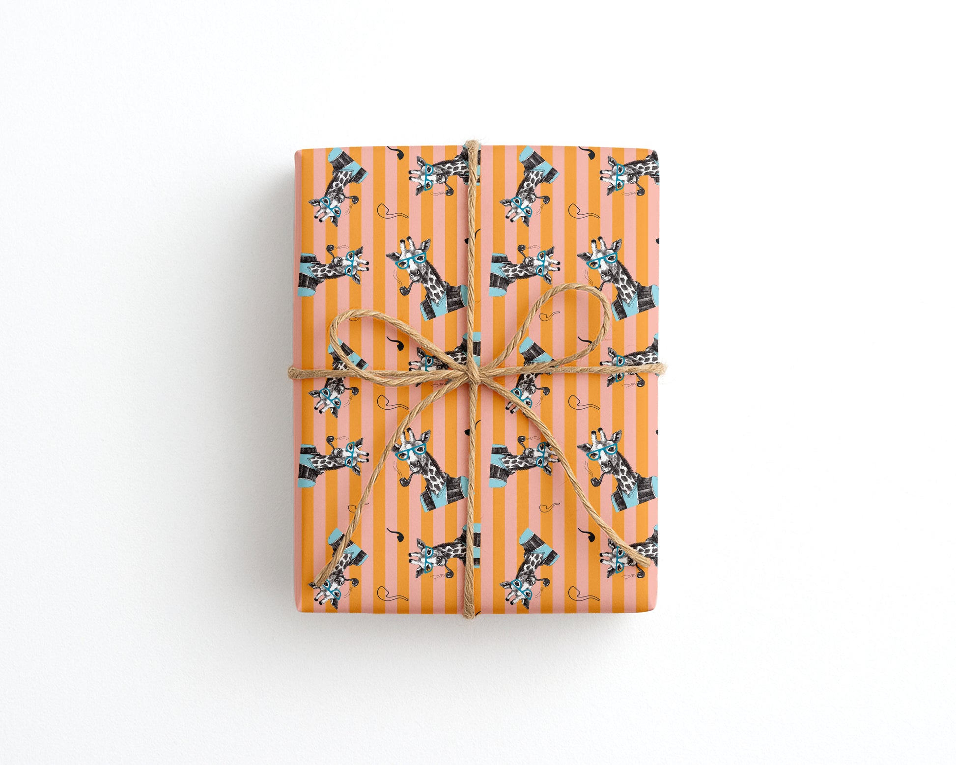 A quirky giraffe wrapping paper perfect for animal lovers and those who enjoy fun, artistic designs. Featuring illustrated giraffes wearing blue glasses on bold orange and peach stripes, it adds a playful and creative touch to any gift. Ideal for birthdays, children’s presents or any special occasion.