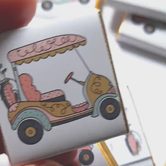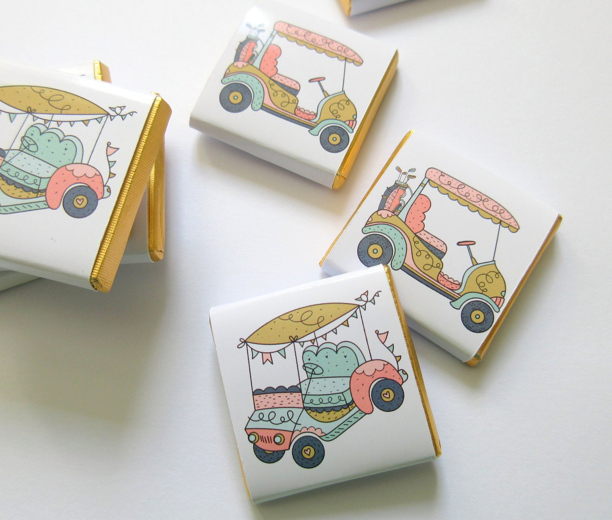 Each chocolate is individually wrapped in gold foil with a glossy printed wrapper and can be personalised on the back with your own message. With two playful golf cart designs included, they add a stylish and fun touch to party tables, sweet stations, and favour bags.