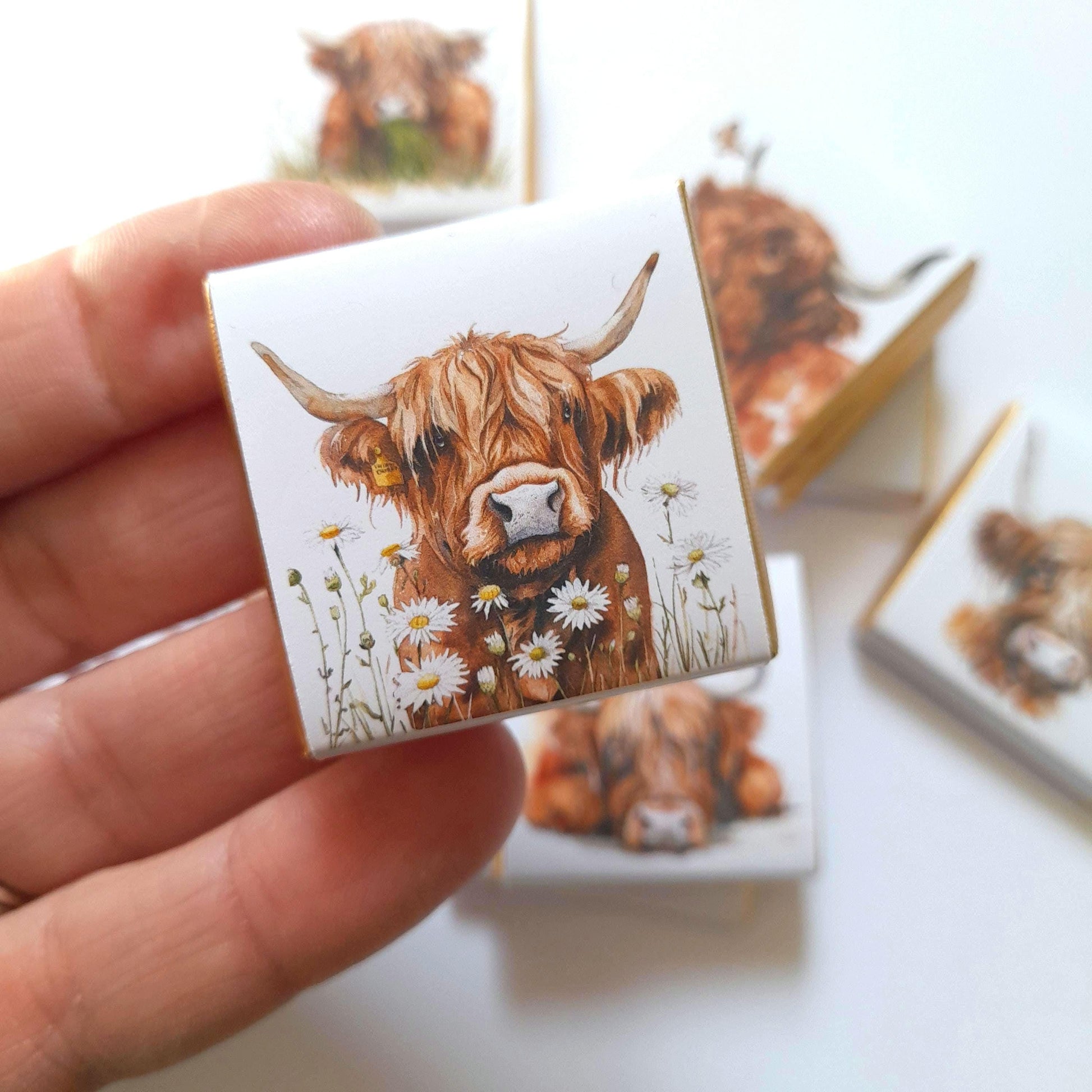 Add a charming, rustic touch to any celebration with these Highland Cow personalised chocolate favours. Handmade in the UK and wrapped in gold foil and gloss paper, each chocolate features an adorable watercolor-style Highland cow design. Every square can be customised with a message on the back, making them both thoughtful and memorable.