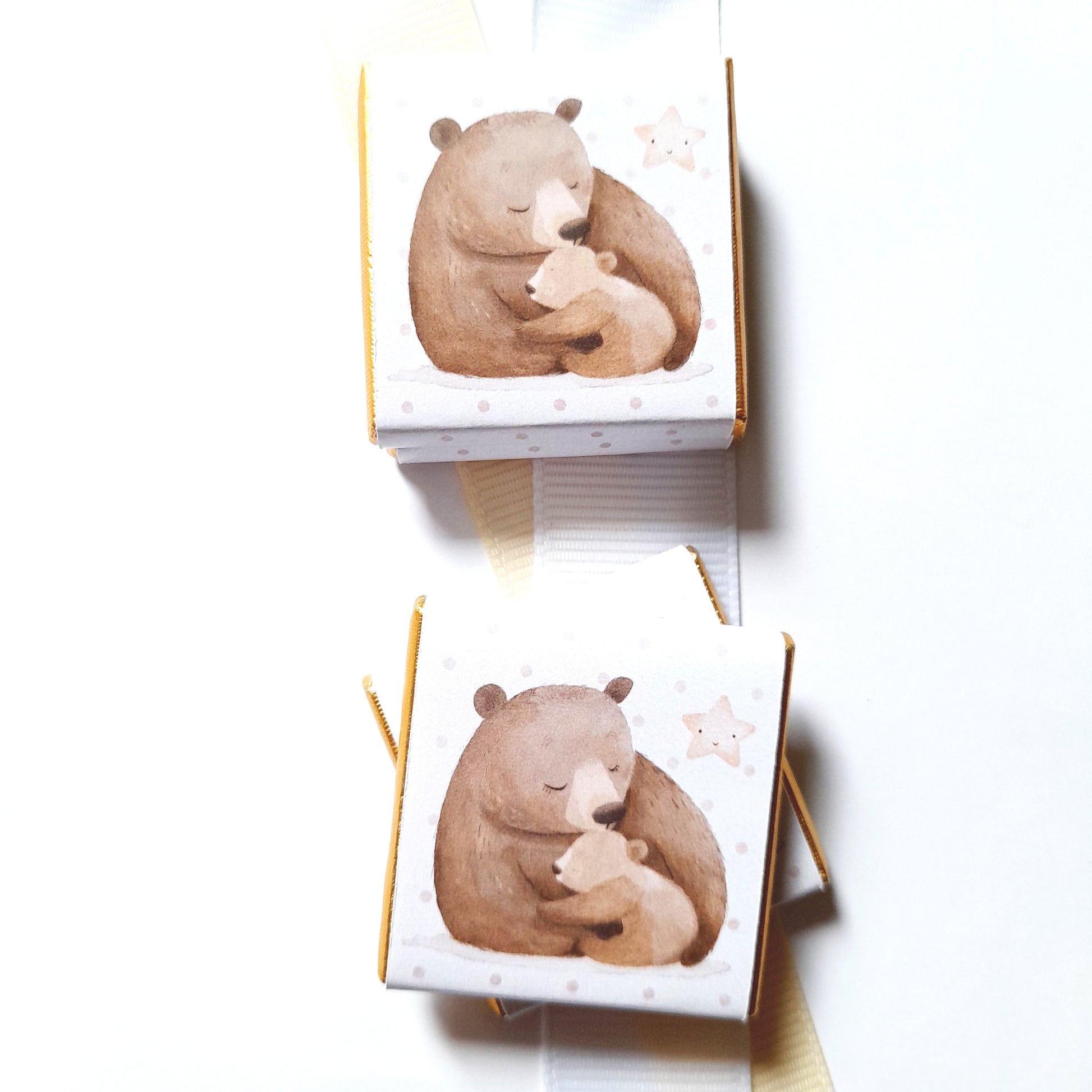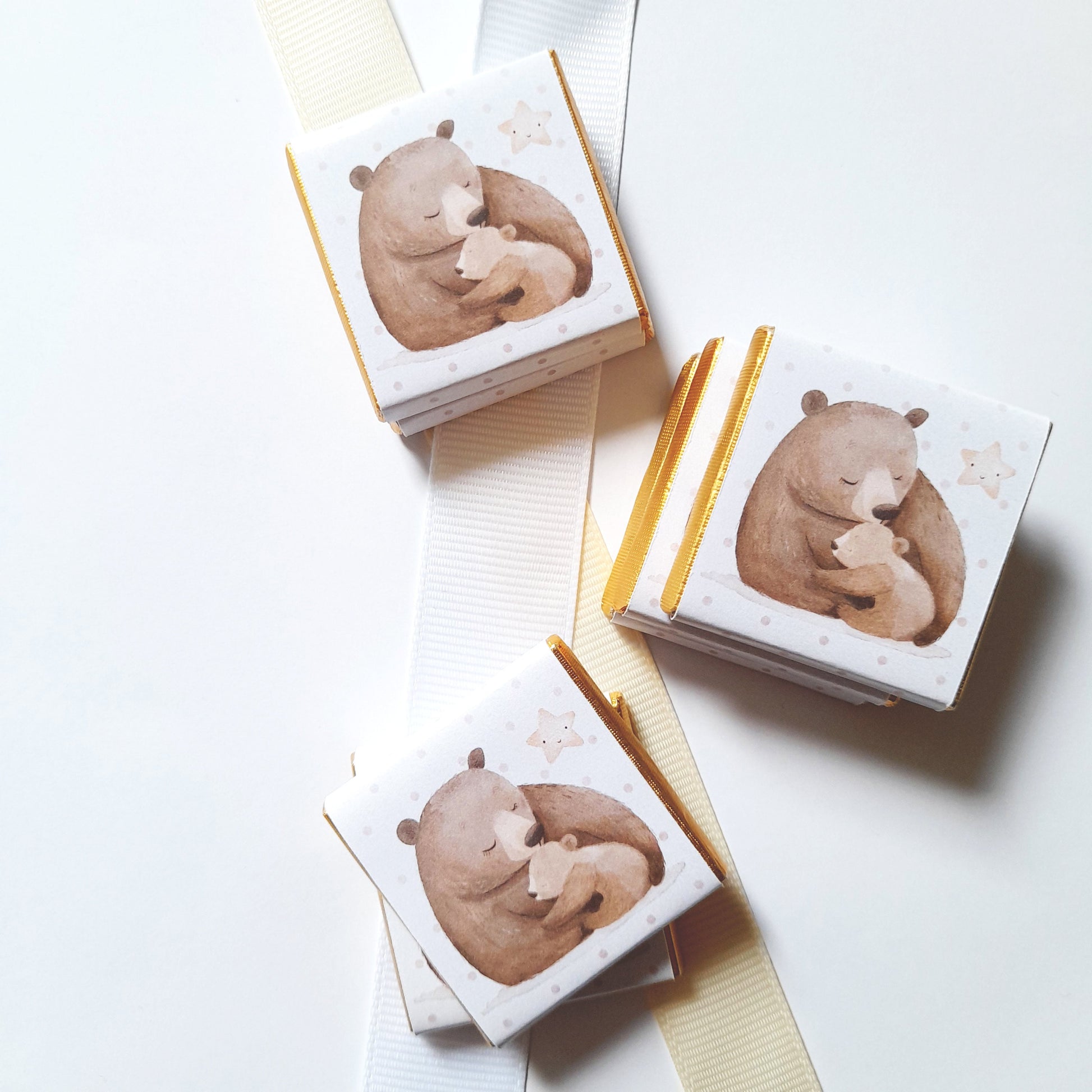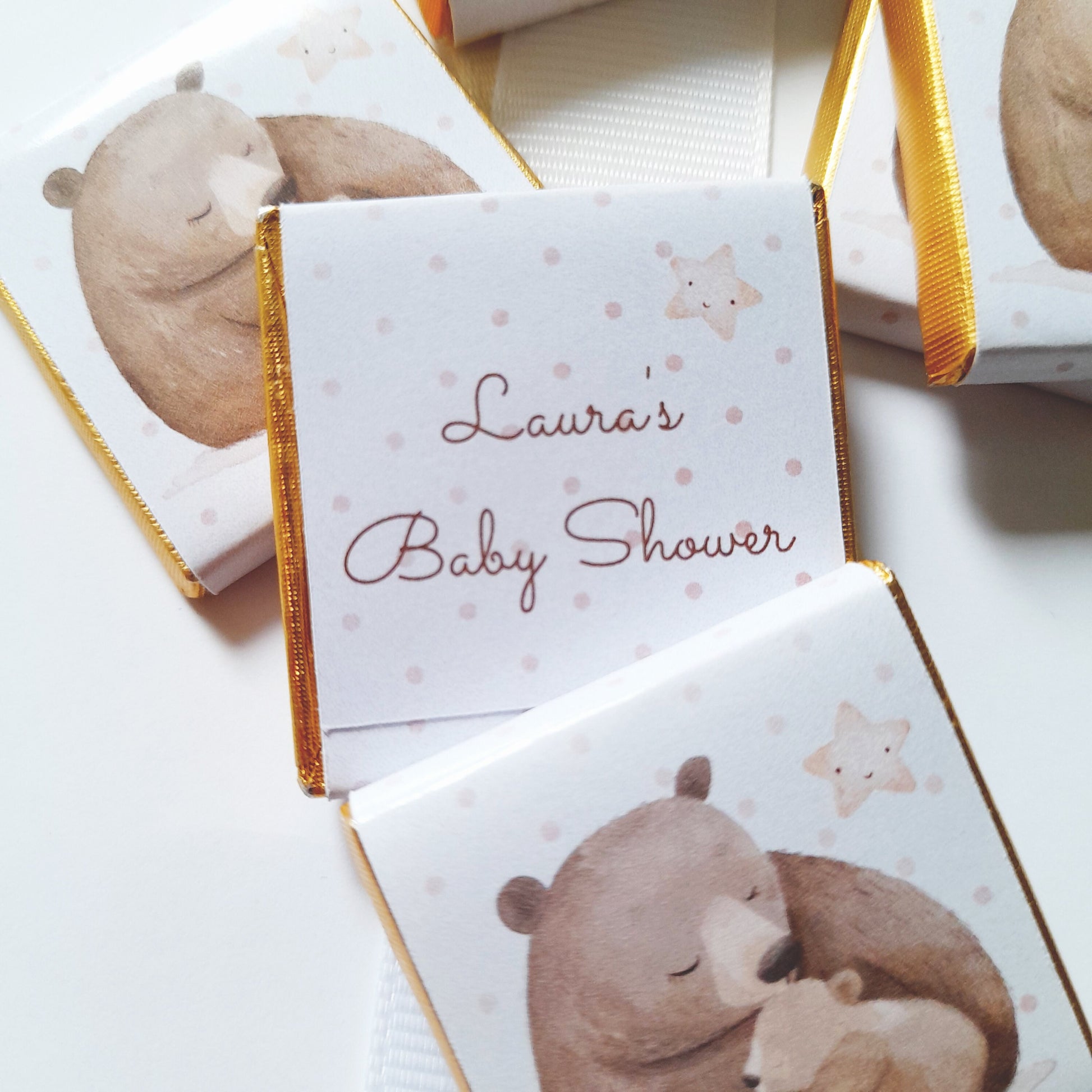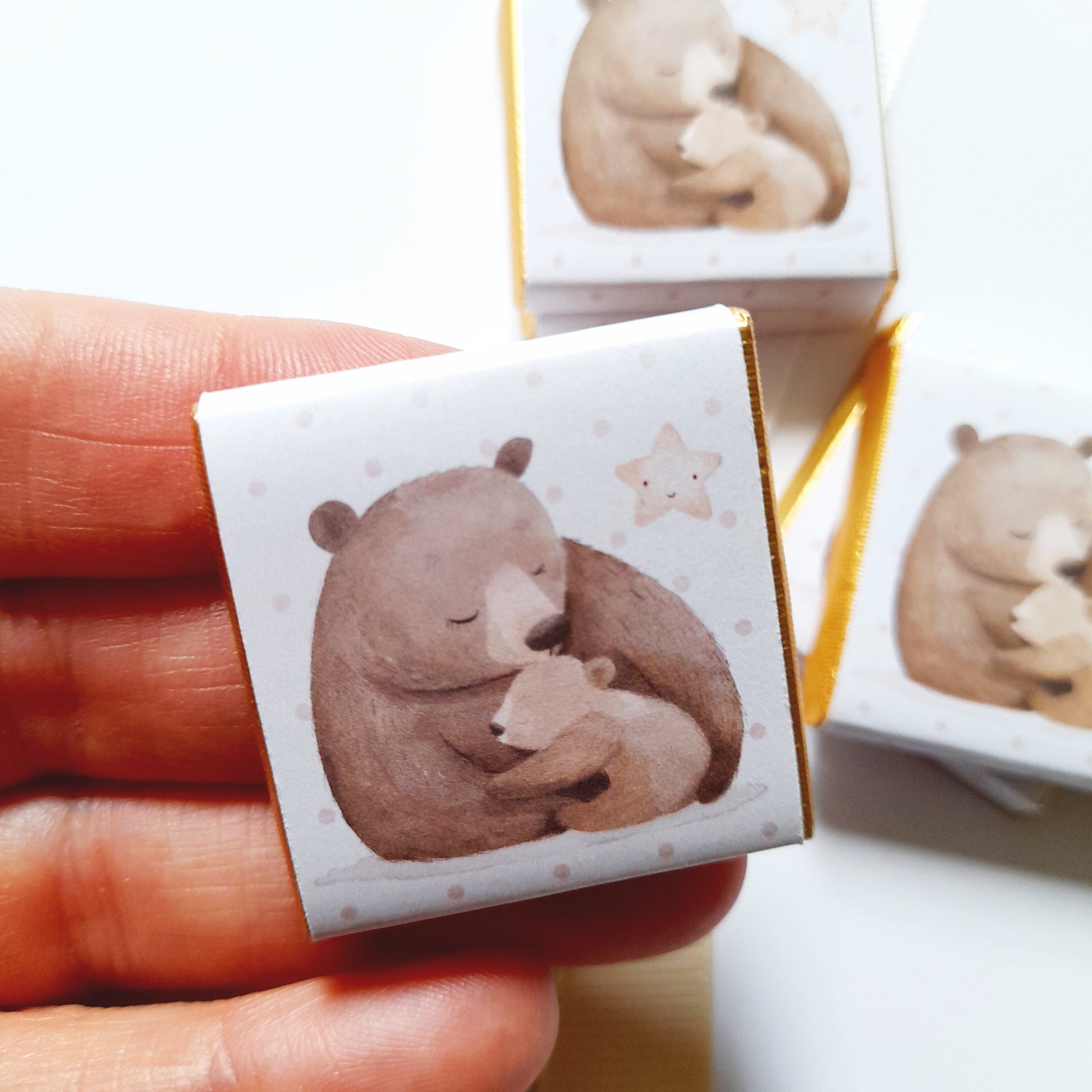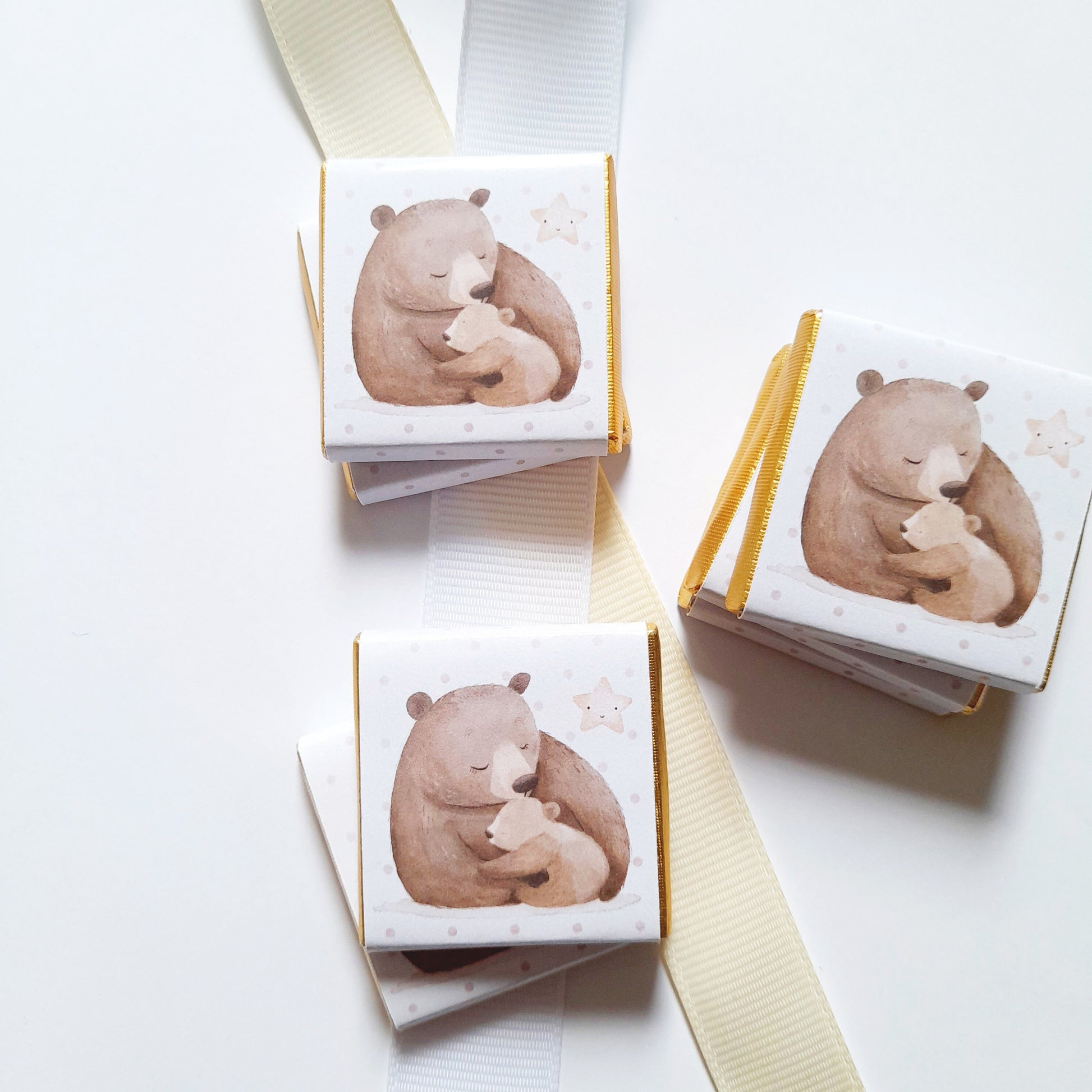 Delight your guests with these Mama Bear Party Chocolate Favours, perfect for baby showers, first birthdays, or as charming little surprises for your guests. Featuring adorable illustrations of a mama bear and her cub, each square chocolate is beautifully wrapped in gold foil with professional glossy paper, and can be personalised with your chosen message on the reverse for a memorable touch.