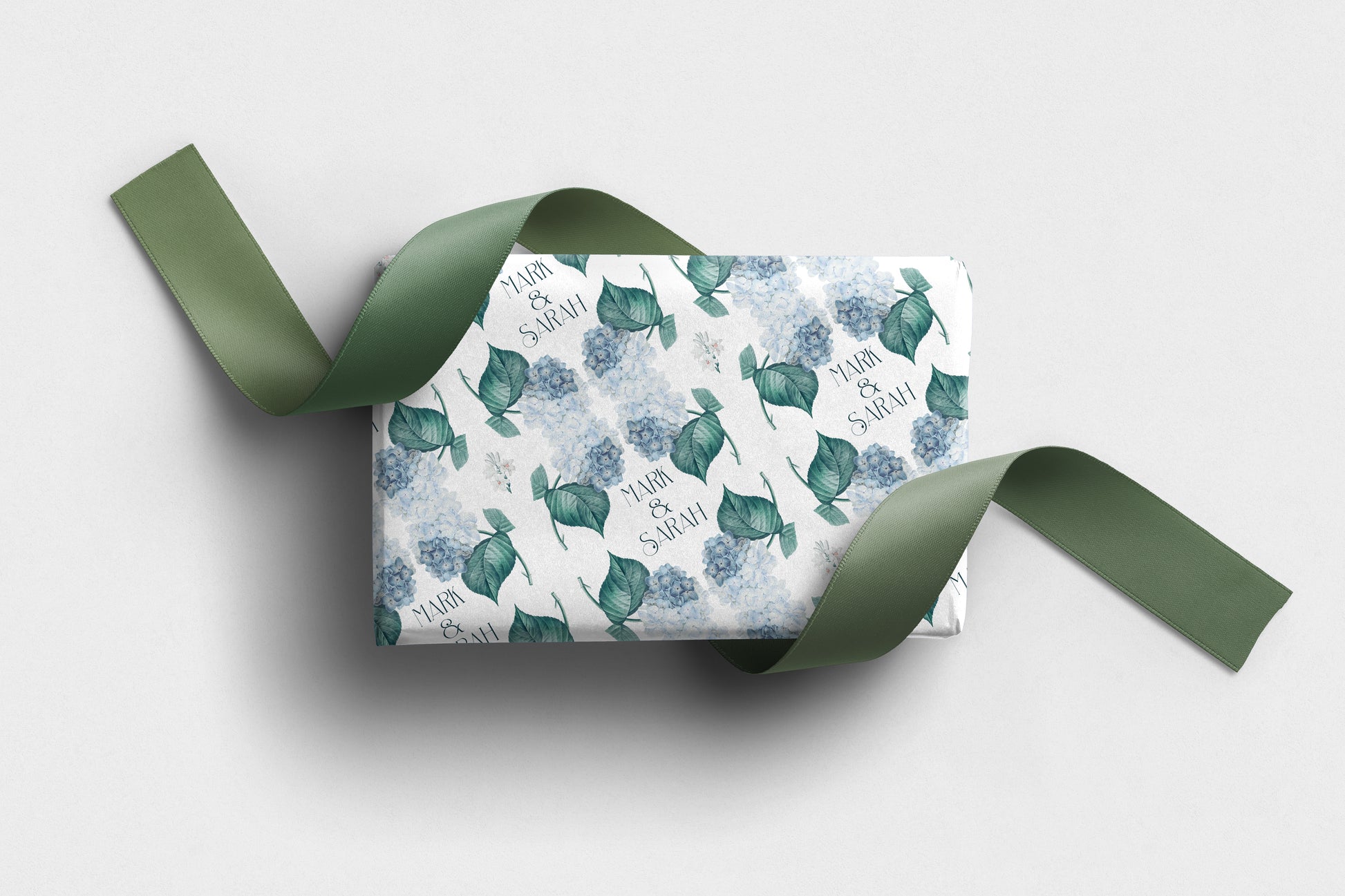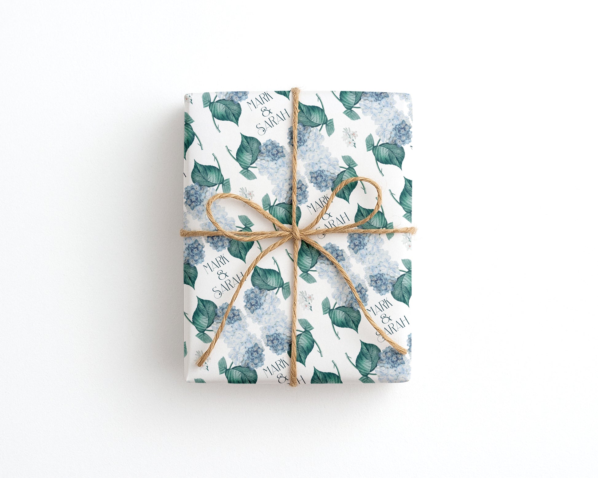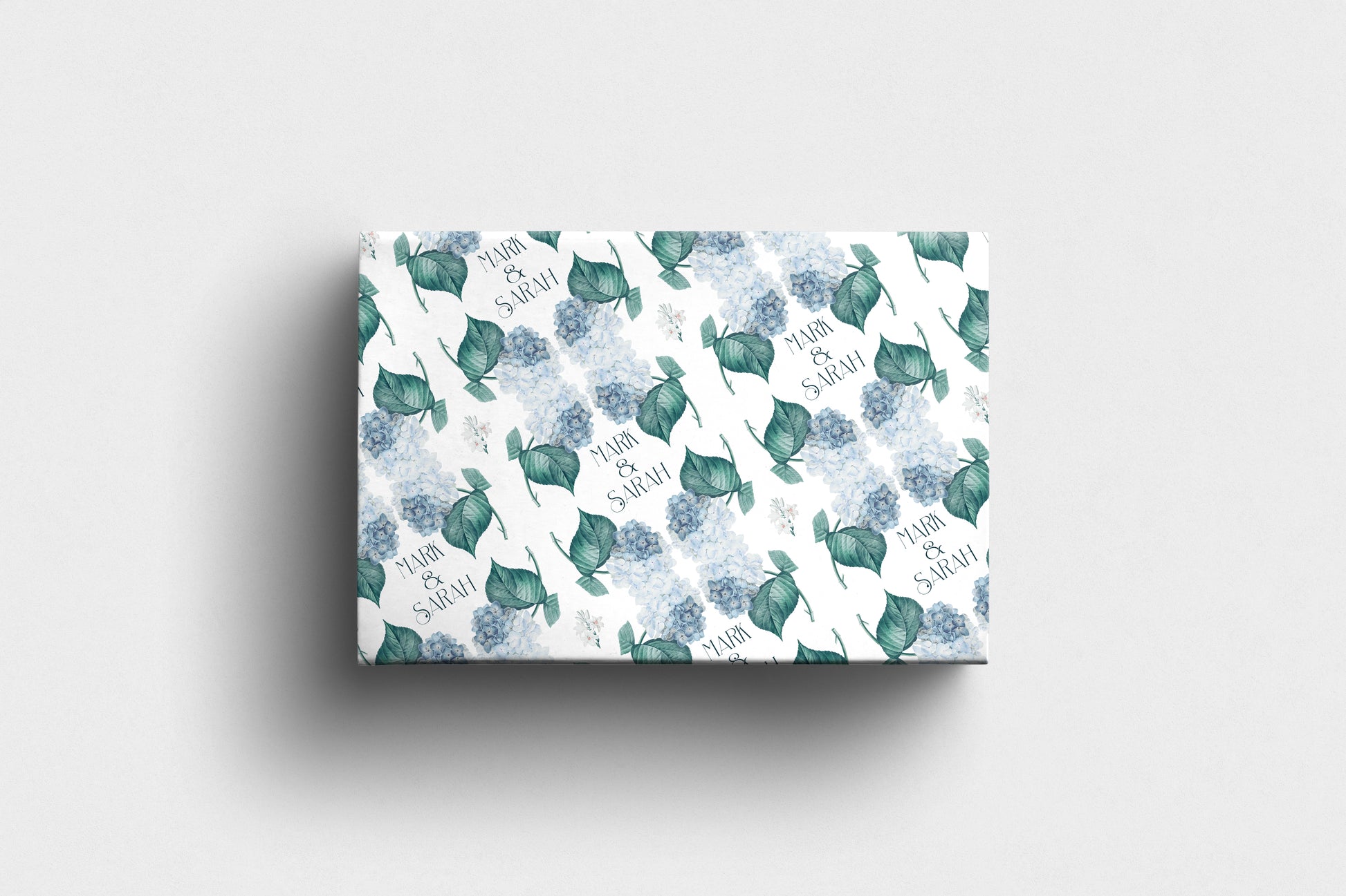 A beautiful hydrangea wrapping paper perfect for weddings, anniversaries and romantic celebrations. Featuring soft blue hydrangeas with delicate green leaves and personalised text such as Mark & Sarah, it brings a thoughtful and elegant touch to any special gift.