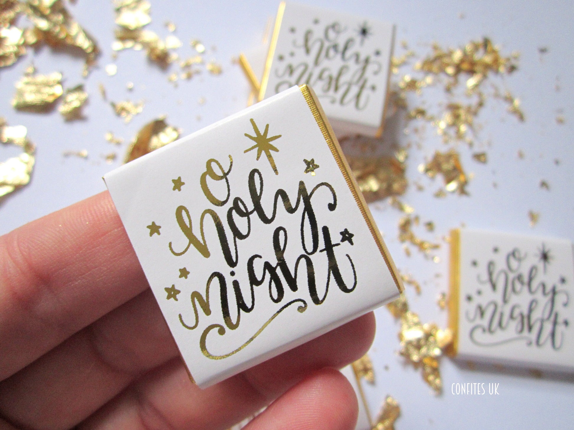 Share the timeless holiday sentiment with these personalised mini chocolates, featuring a refined “O Holy Night” design in white and gold. Each pack contains 25 individually wrapped square chocolates (approx. 3 × 3 cm, 5 g), with space on the reverse for your own short festive message.