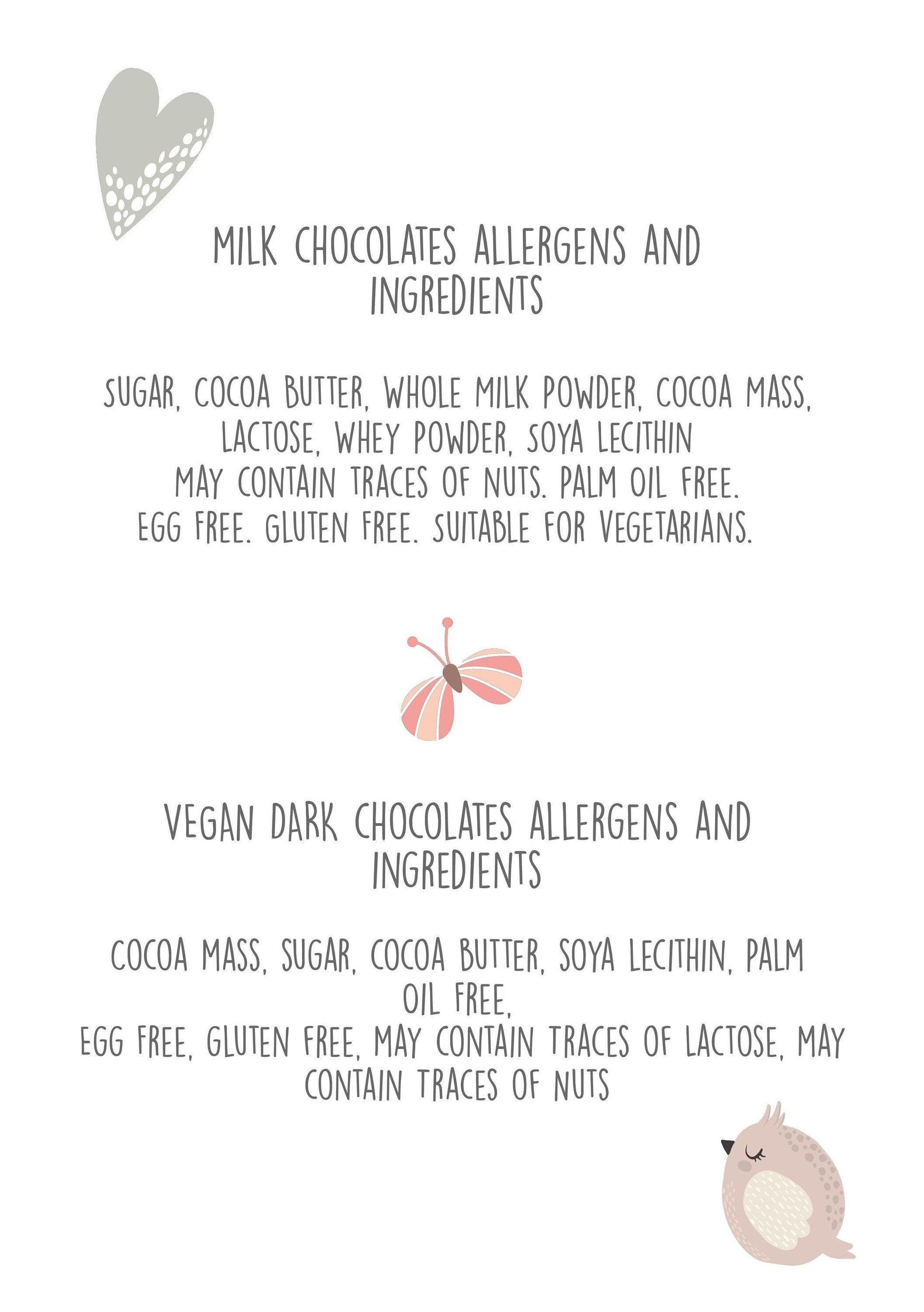 Crafted by a leading UK chocolatier using Fairtrade chocolate, this pack includes 25 squares, each measuring approximately 3 cm × 3 cm (1.5 inches) and weighing about 5 g. The chocolates are wrapped in gold foil and professional glossy paper, and are thoughtfully made without egg, gluten, alcohol, or palm oil. Illustrations are by @NatAtelier