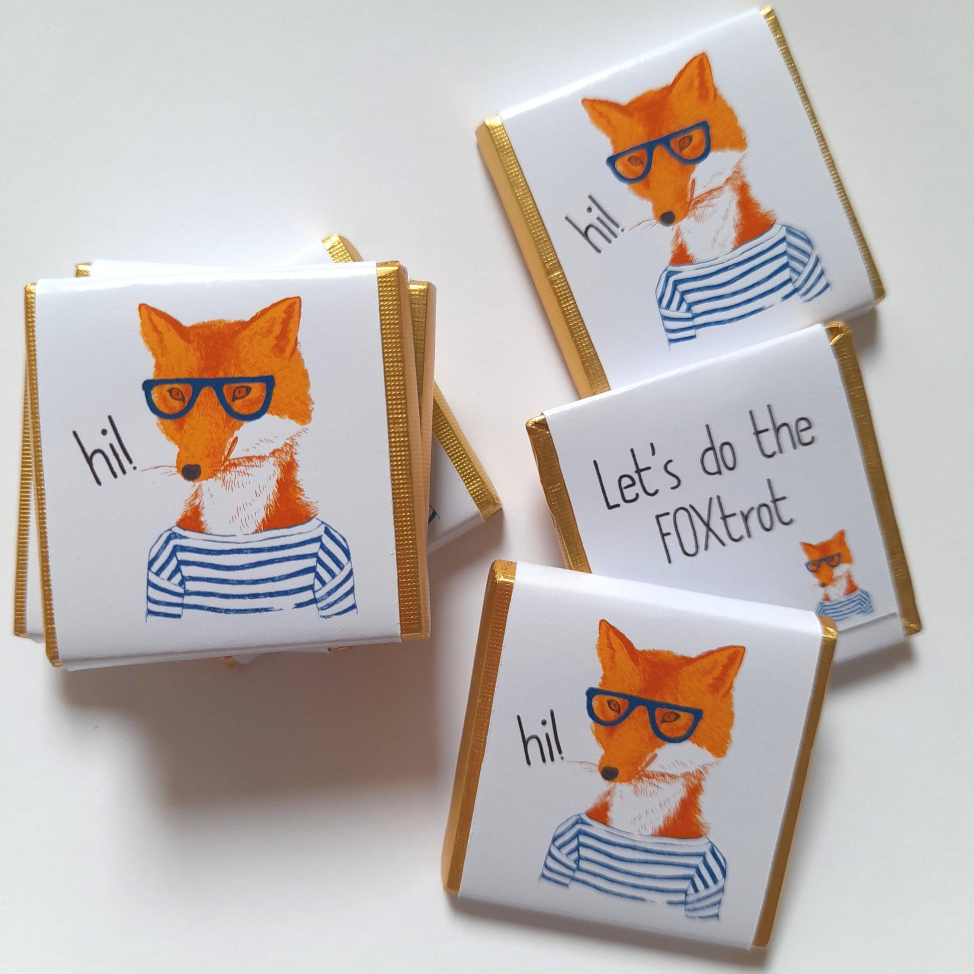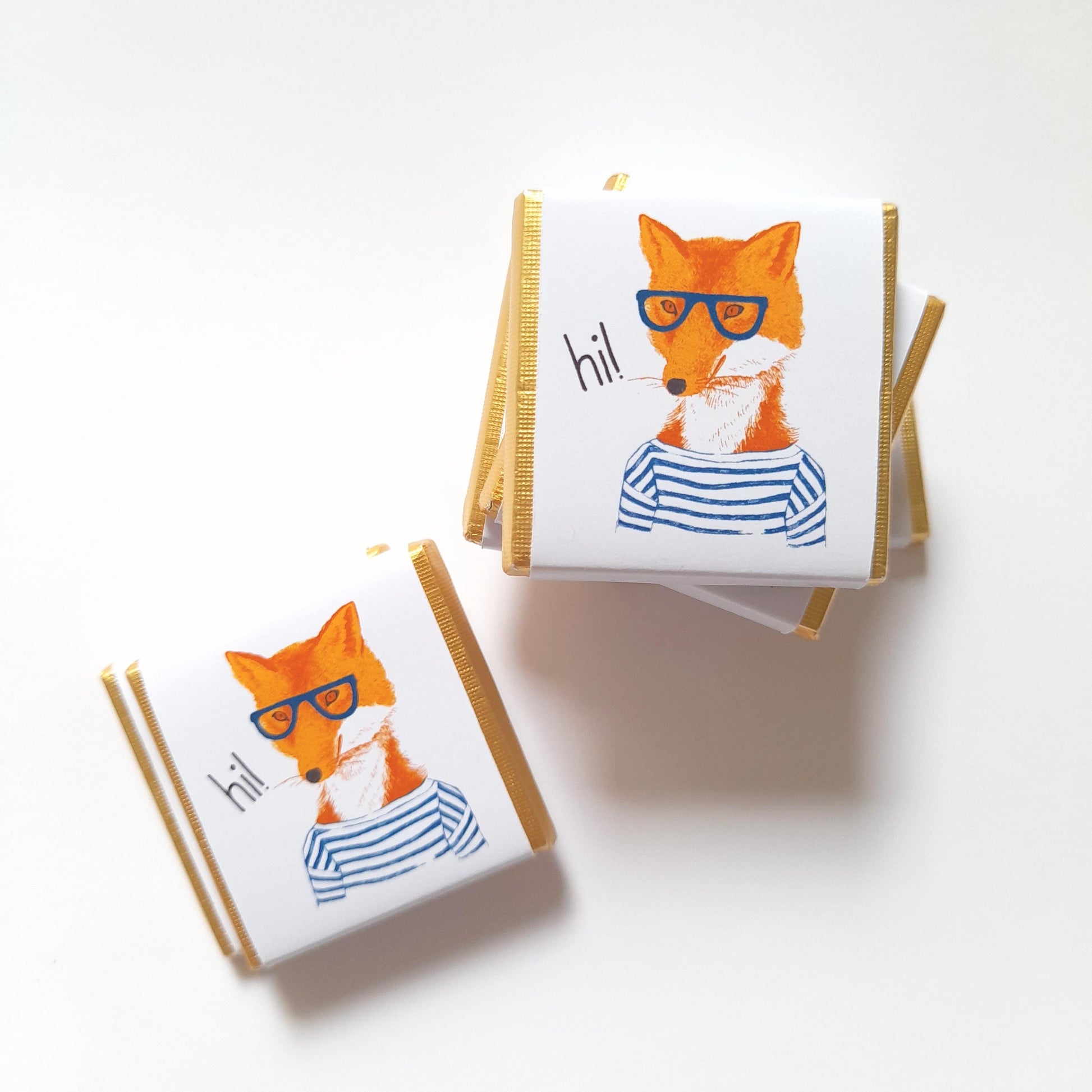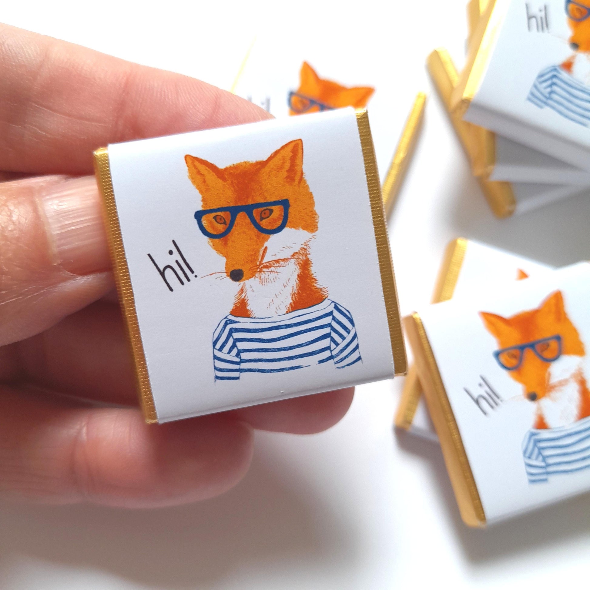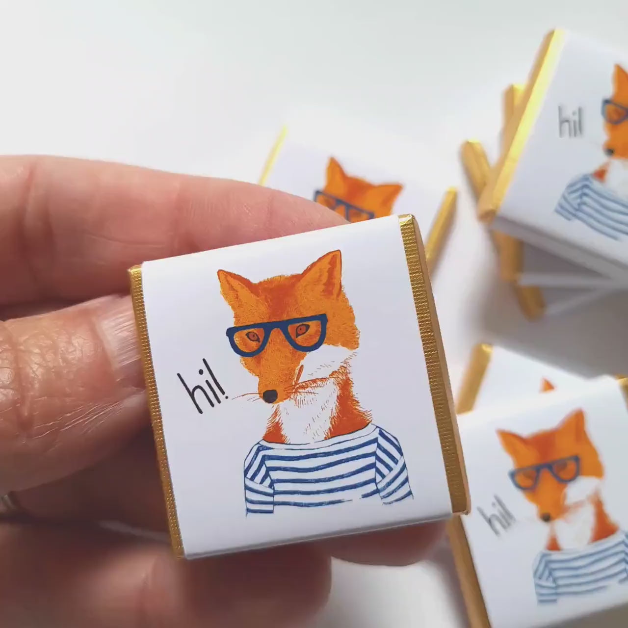 Celebrate in style with these delightful Reader Fox Chocolate Favours—perfect for children’s parties, baby showers, or whimsical gatherings. Each square chocolate is beautifully wrapped in gold foil and glossy paper, showcasing a charming fox wearing blue glasses and a striped jumper.